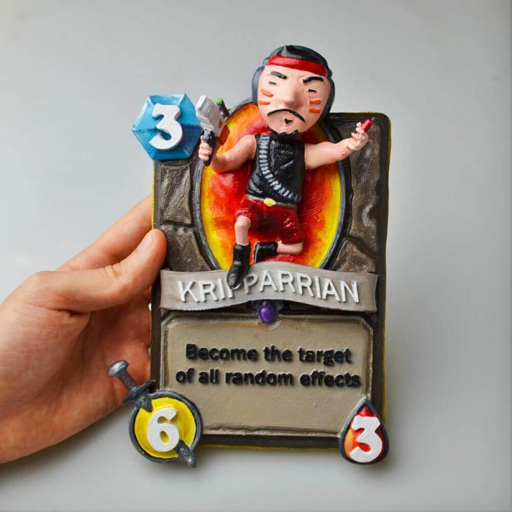 5: The Kripparrian Card. Octavian “Kripparrian” Moroșan is a noted player of Hearthstone. You may know him from his daily late night stream on Twitch. The custom made Hearthstone card was made my Ricardo Salomao and Simone Fontana, who are known to the maker community as 3DNA. The print was designed and hand-colored by them.